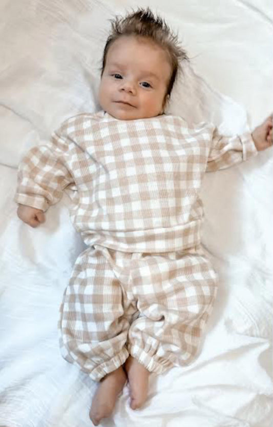 gingham tracksuit set cream and white